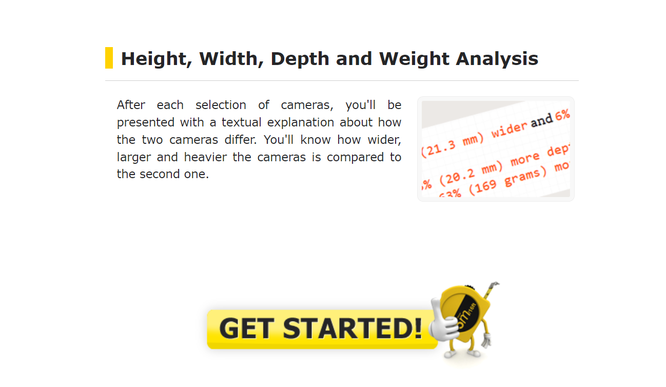 Digital Camera Size Comparison Tool Camera Size is a free online digital camera comparison tool. This web application was designed to help you compare one camera's size relative to another camera, and view each camera from different sides. The site is bein